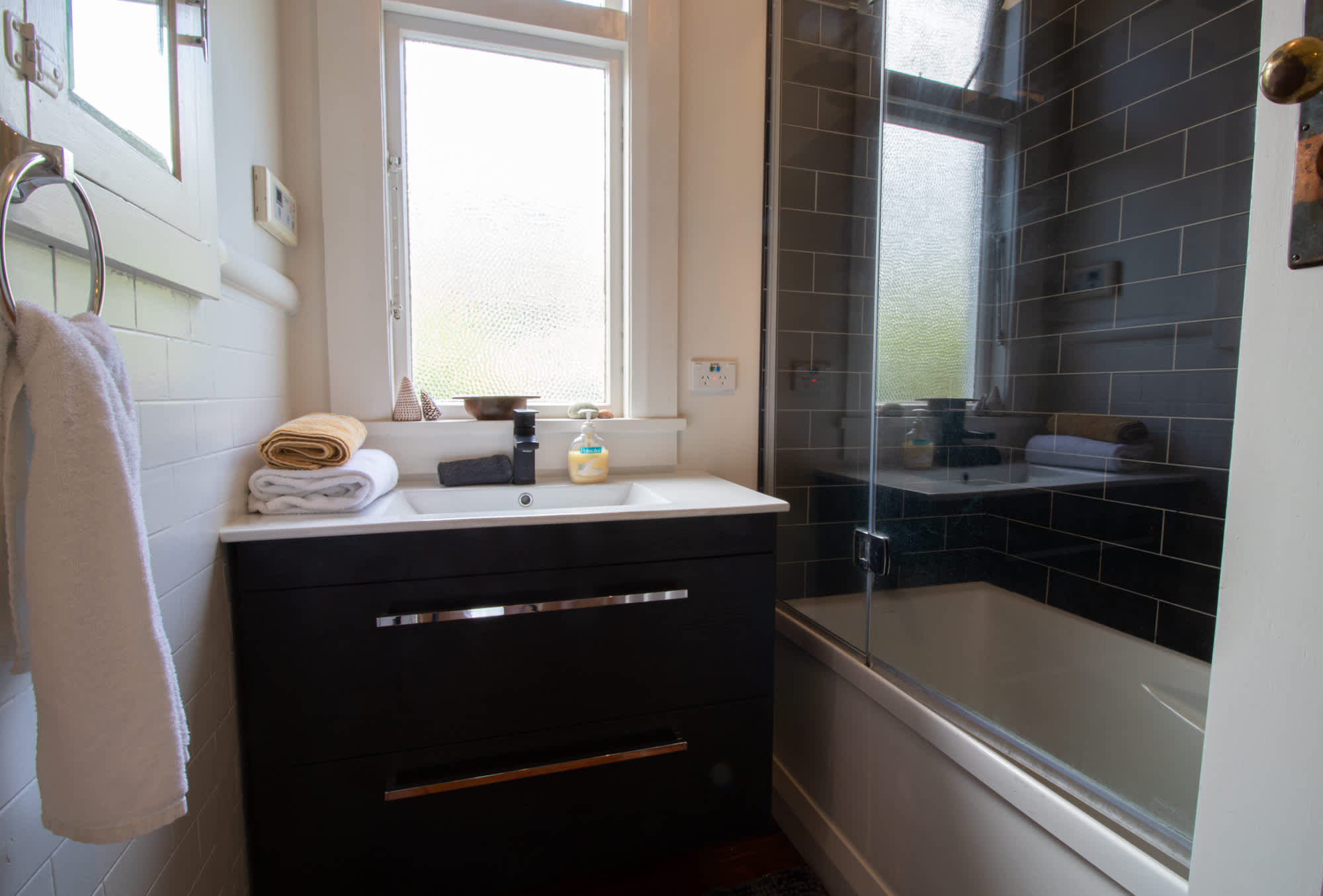 - Modern bathroom with shower over the bath.