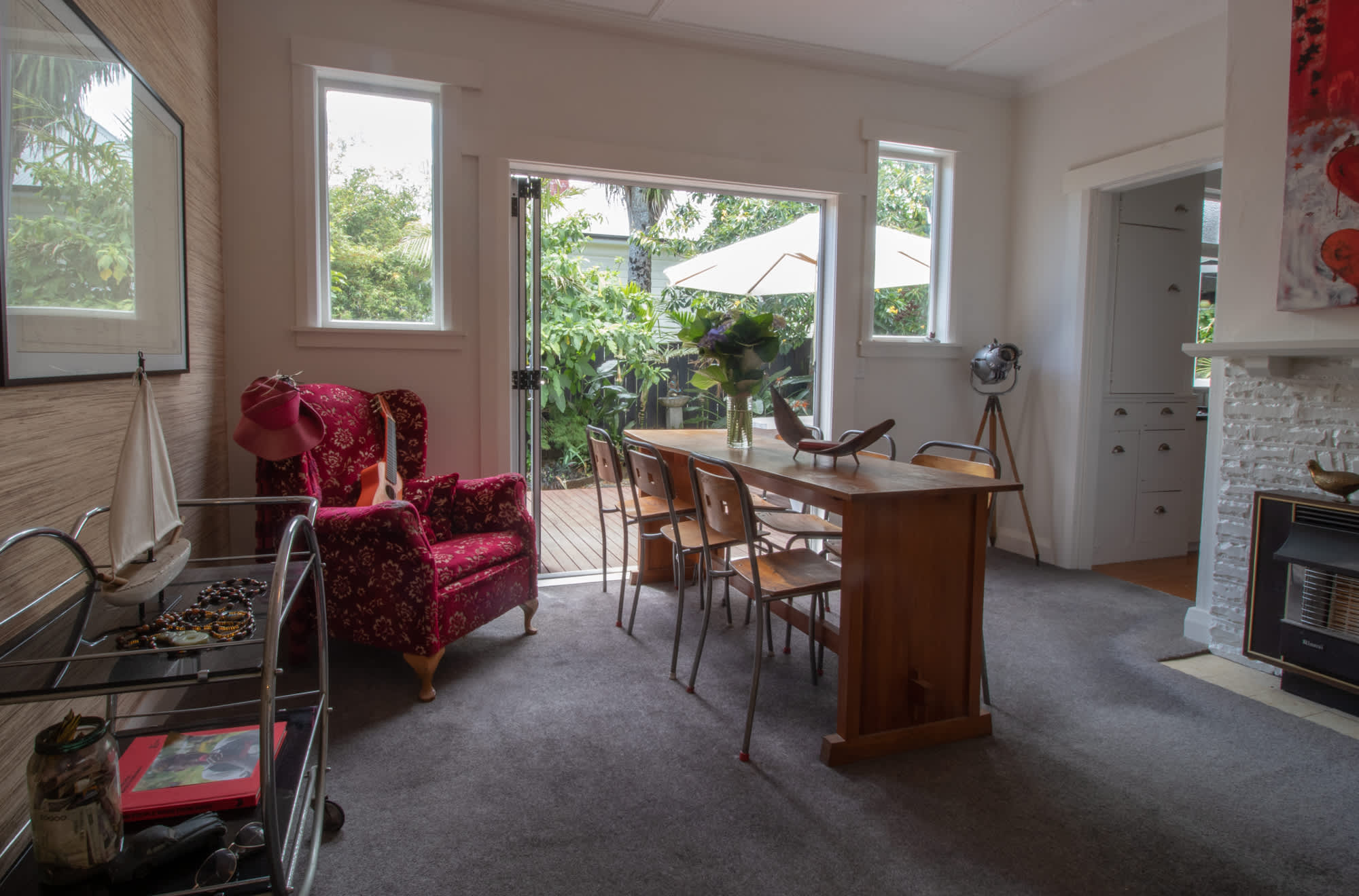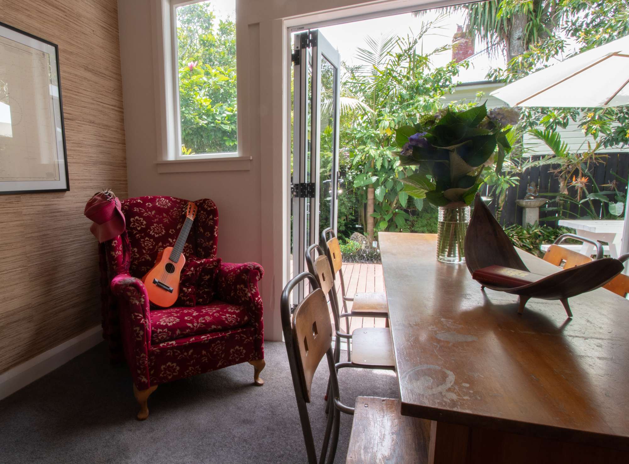The living space welcomes you with a chilled-out vibe, perfect for stretching out and relaxing after a busy day of exploring. The heart of the home features a dining room that opens beautifully to the outdoors through a large bifold door, allowing you to enjoy the expansive deck and garden while cooking on the BBQ.