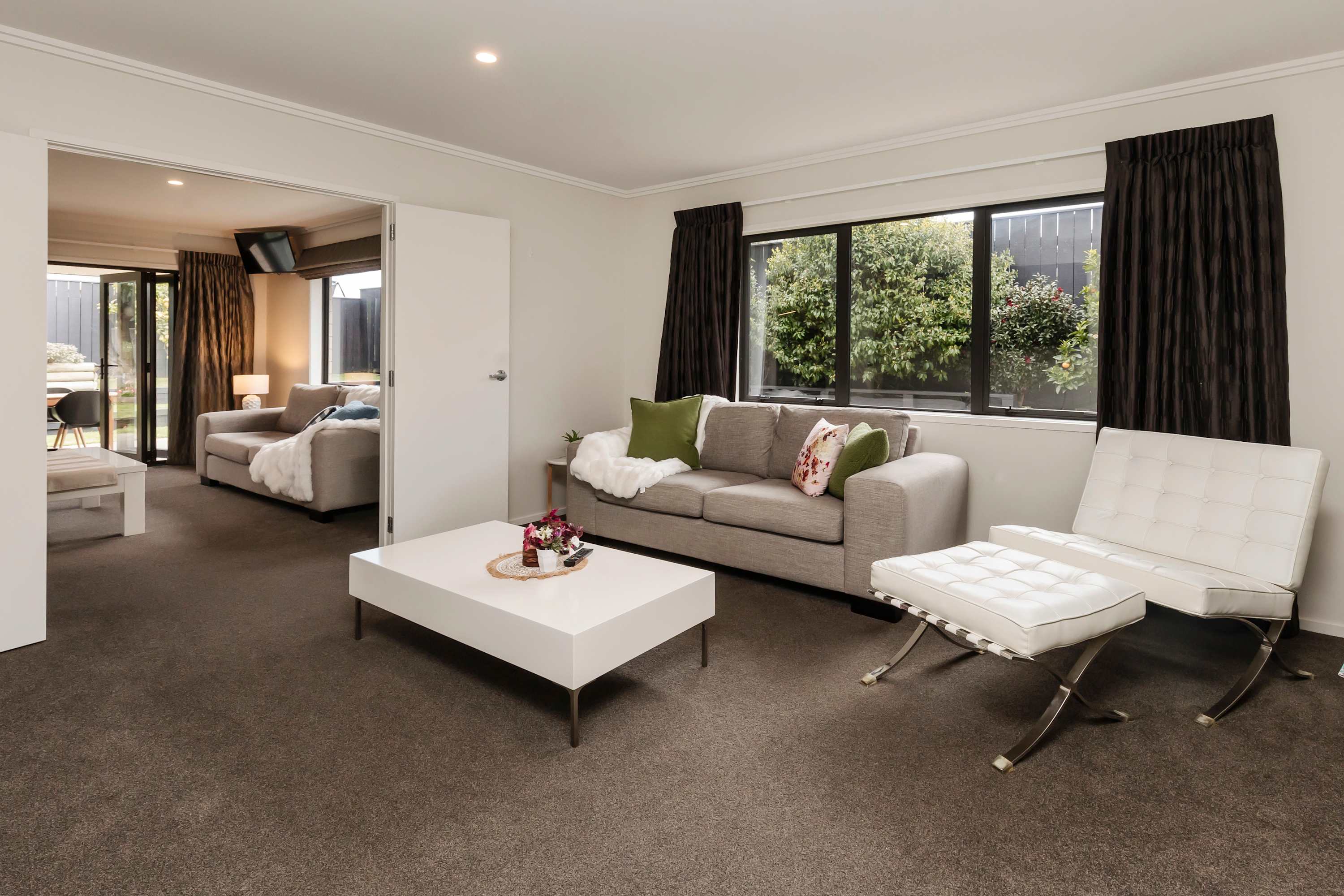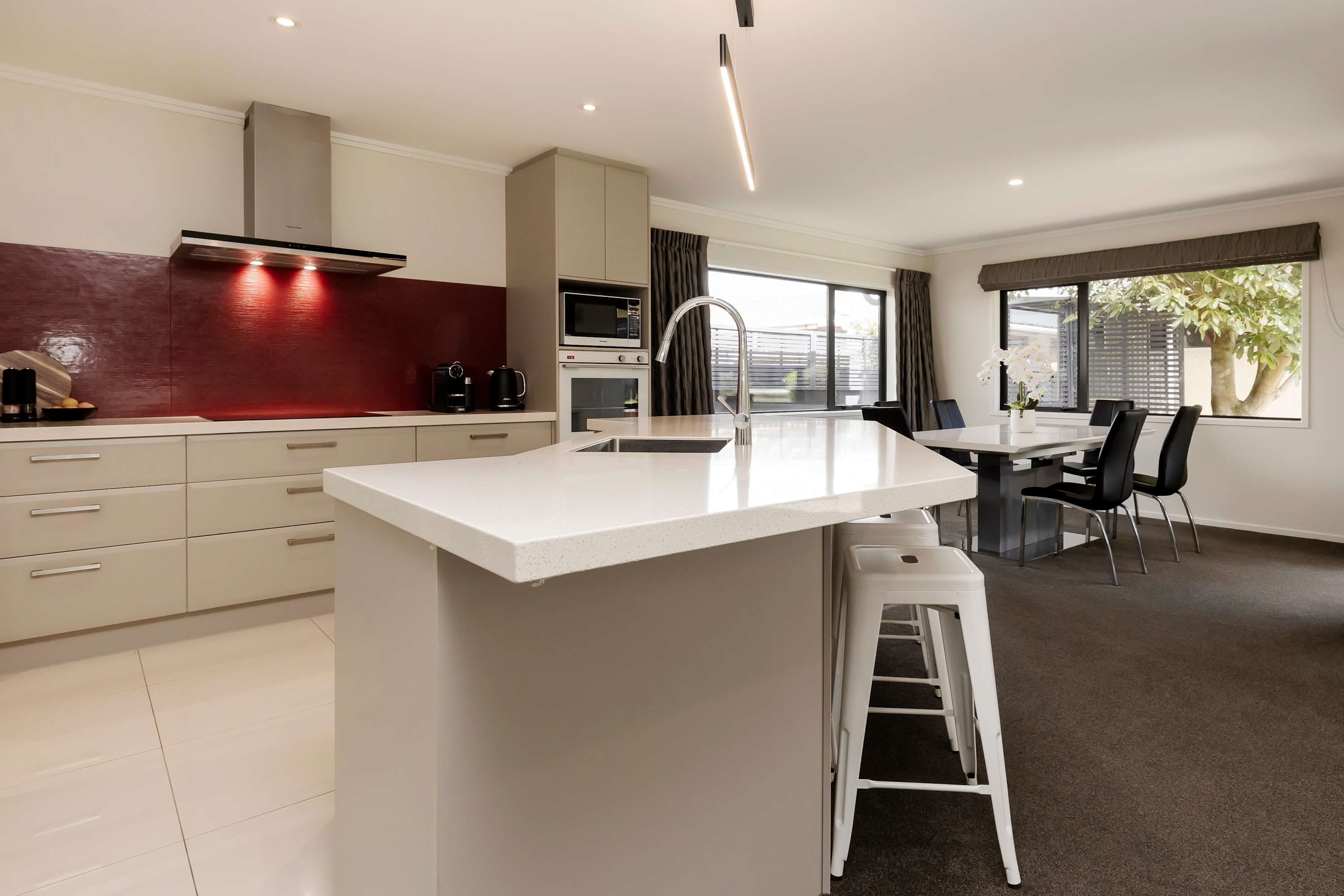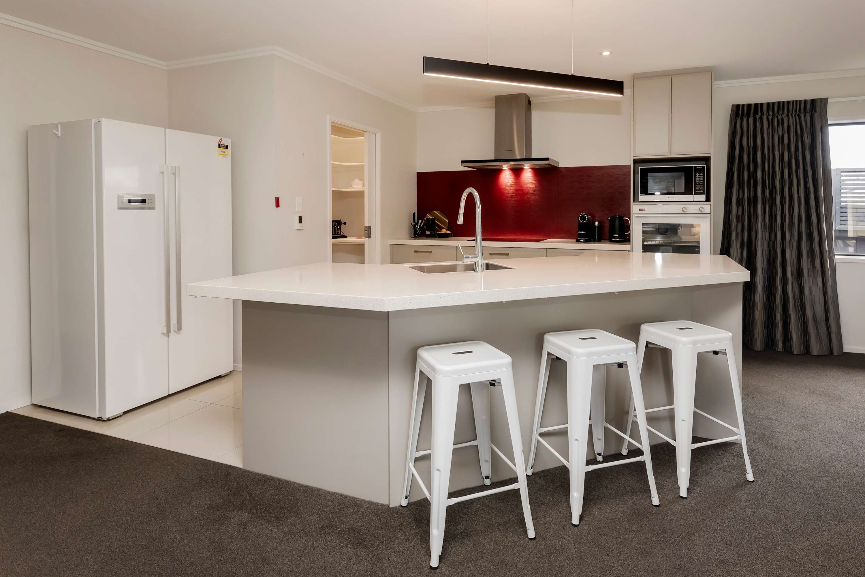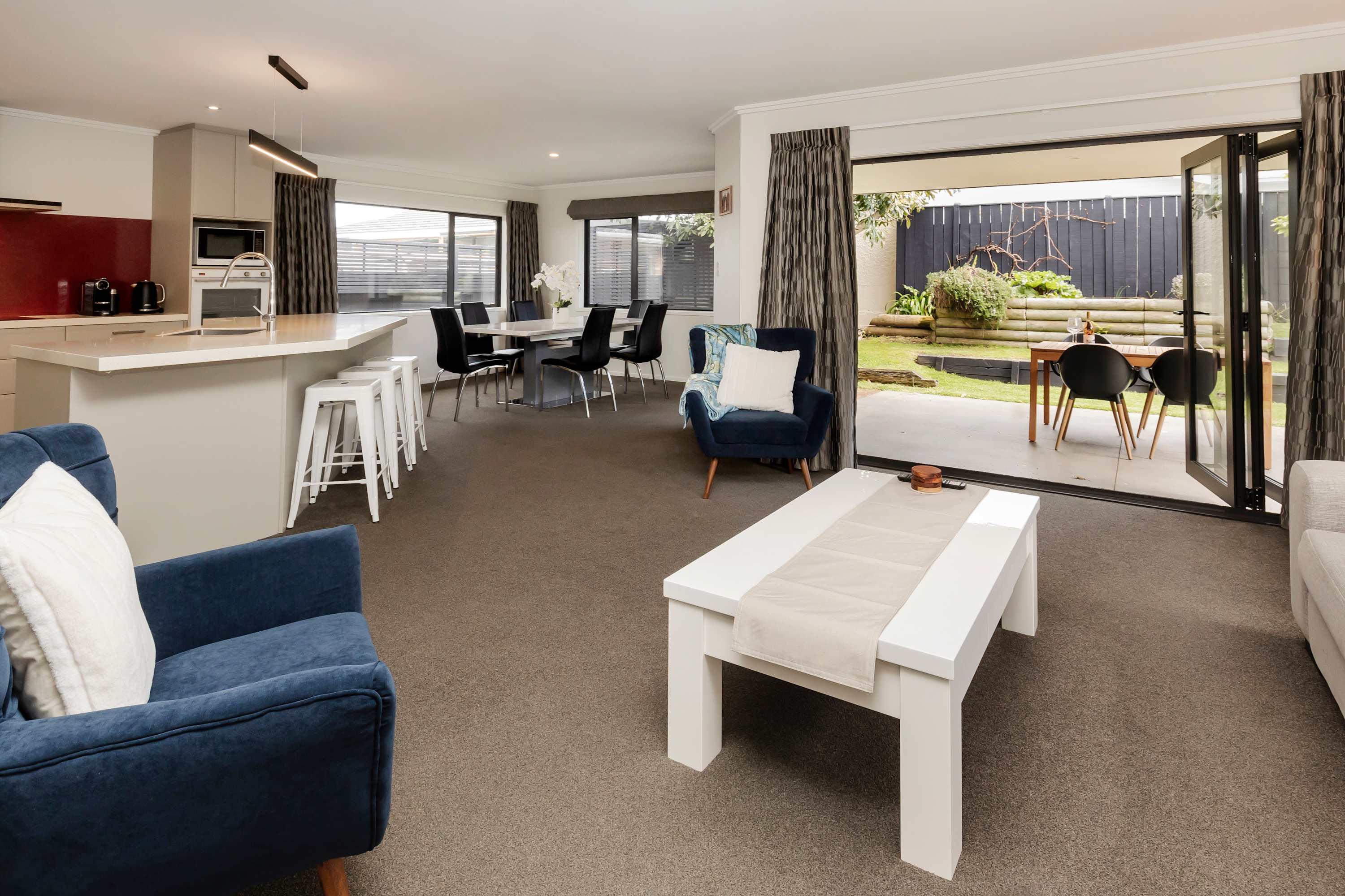 At the hub of this holiday home lies a large functional social kitchen with a large island and walk-in scullery. Relaxation begins here, with easy indoor-outdoor flow leading to the covered outdoor entertaining area, perfect for any weather. A private garden sets the scene for indoor-outdoor entertaining, while expansive open-plan living areas can be adjusted to create more intimate spaces depending on your mood.