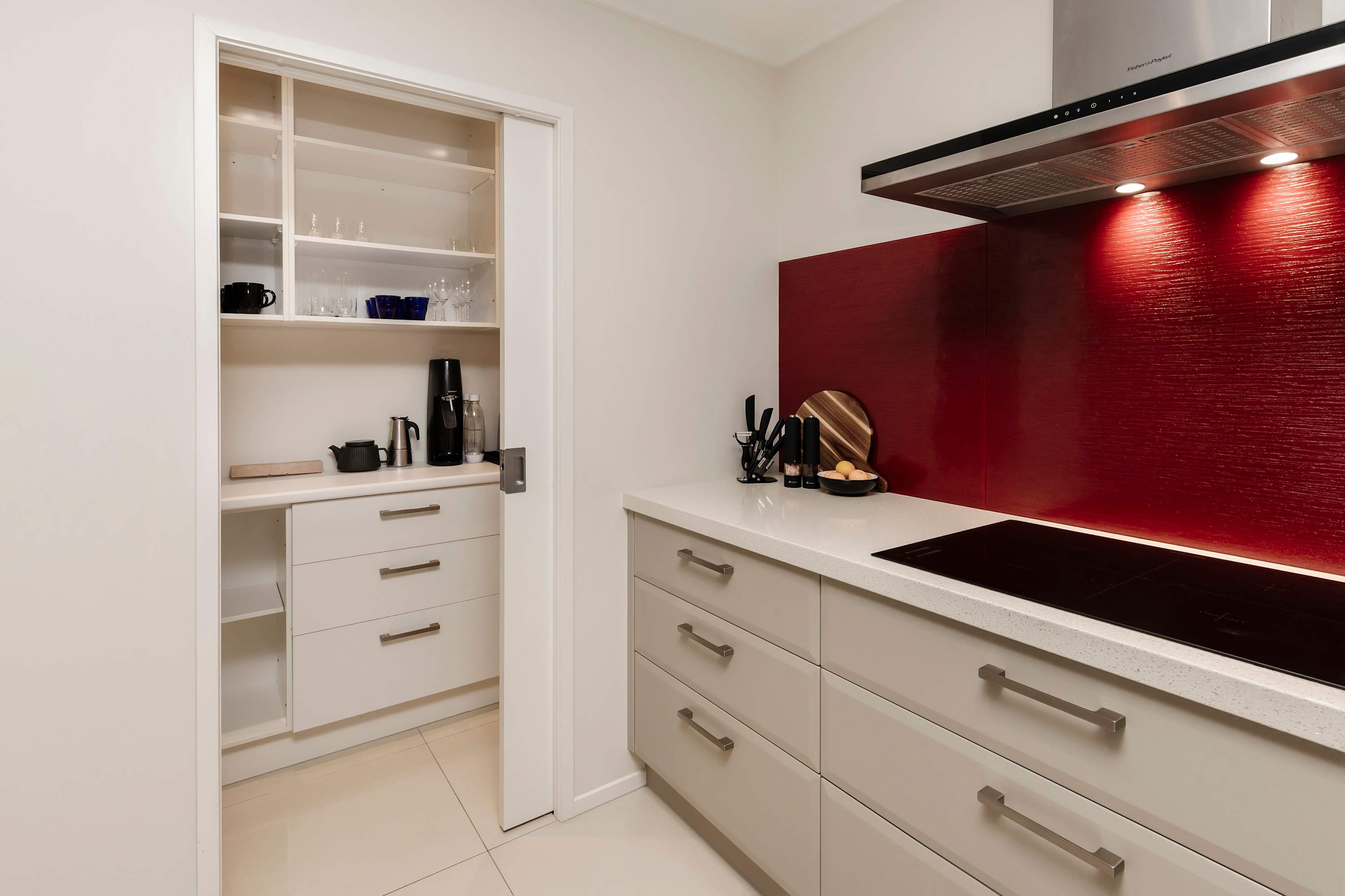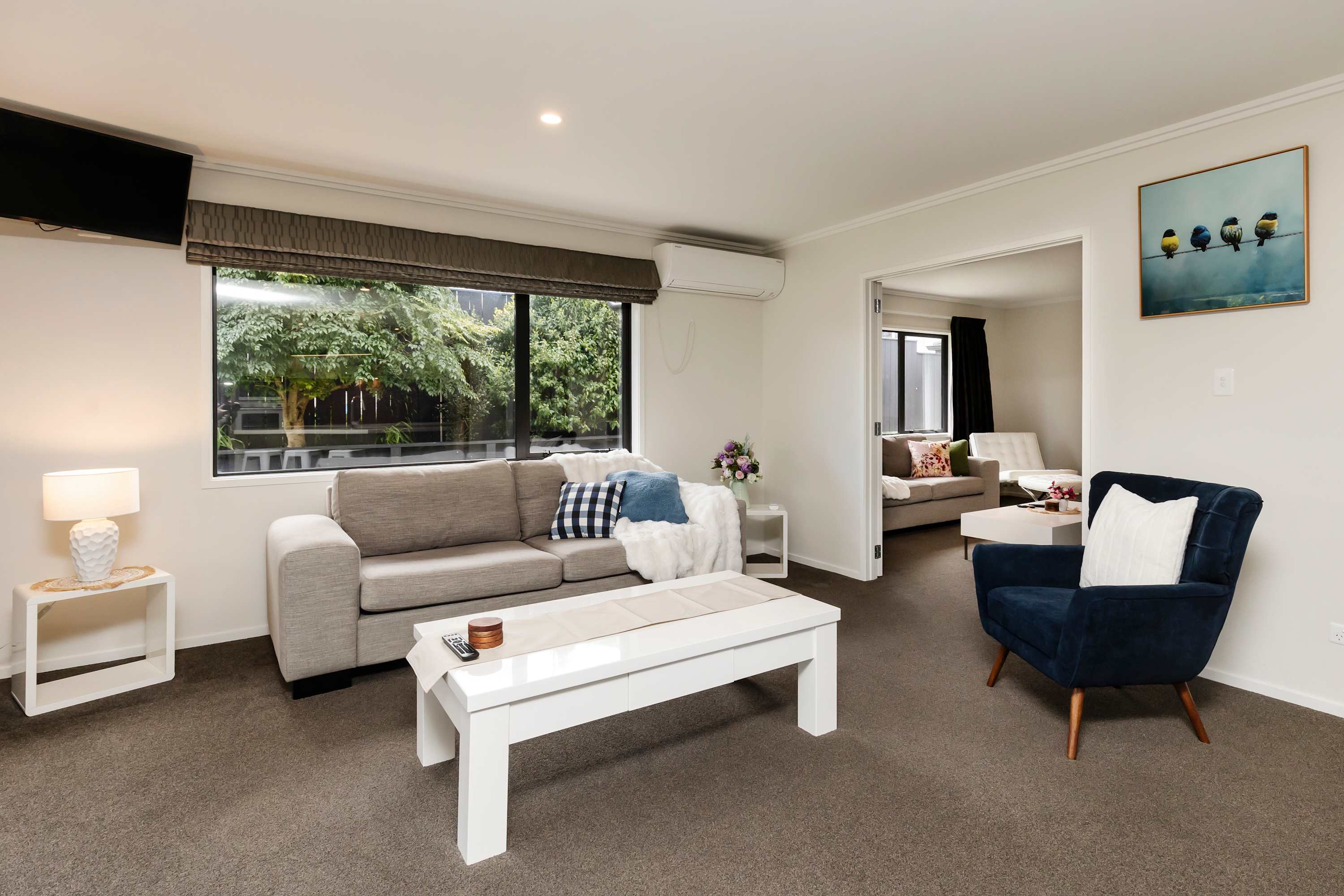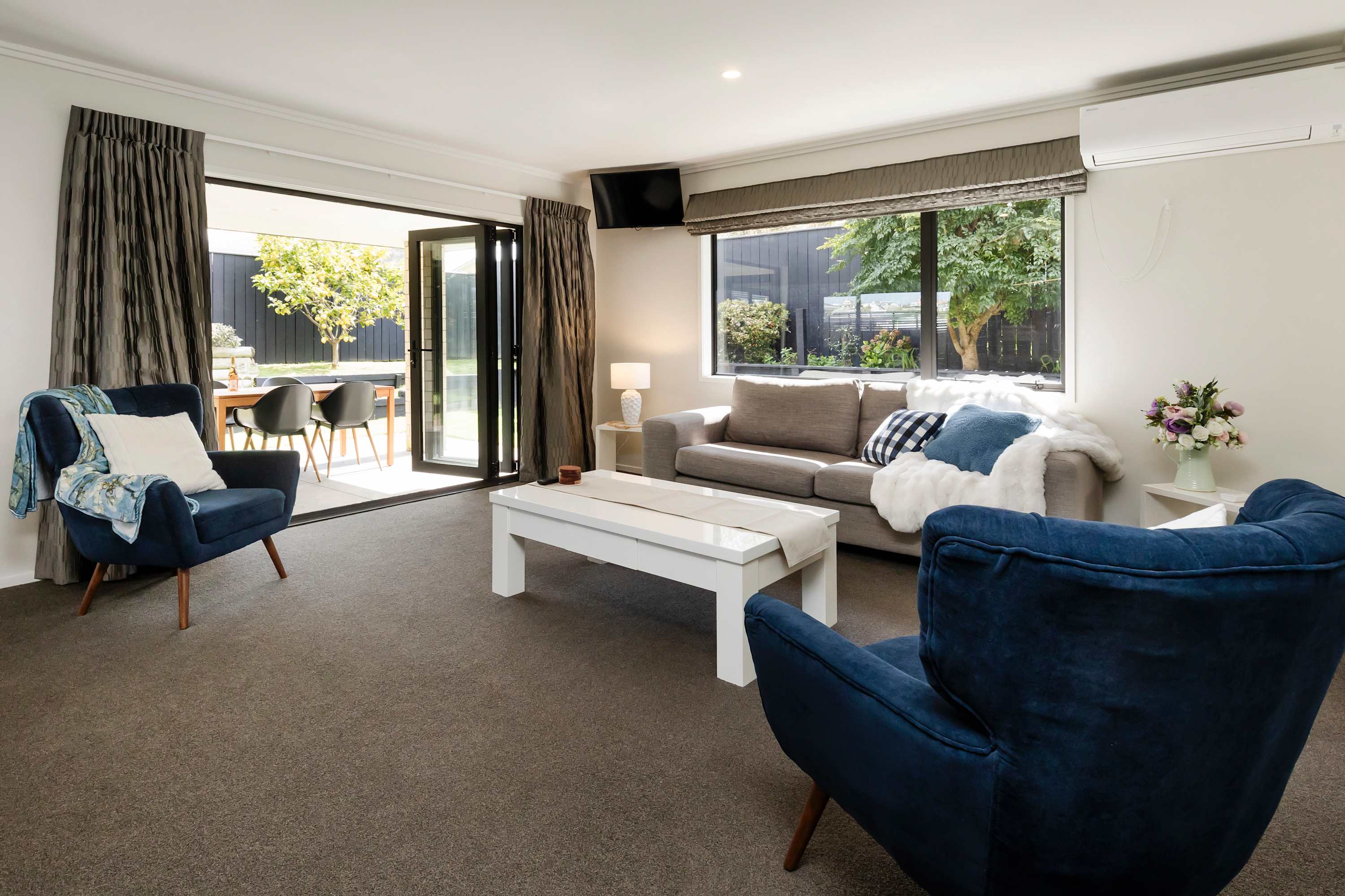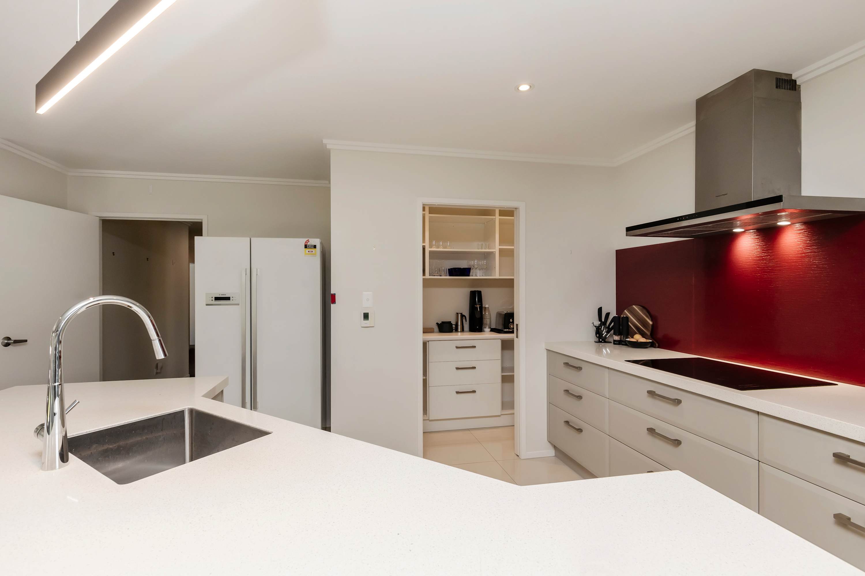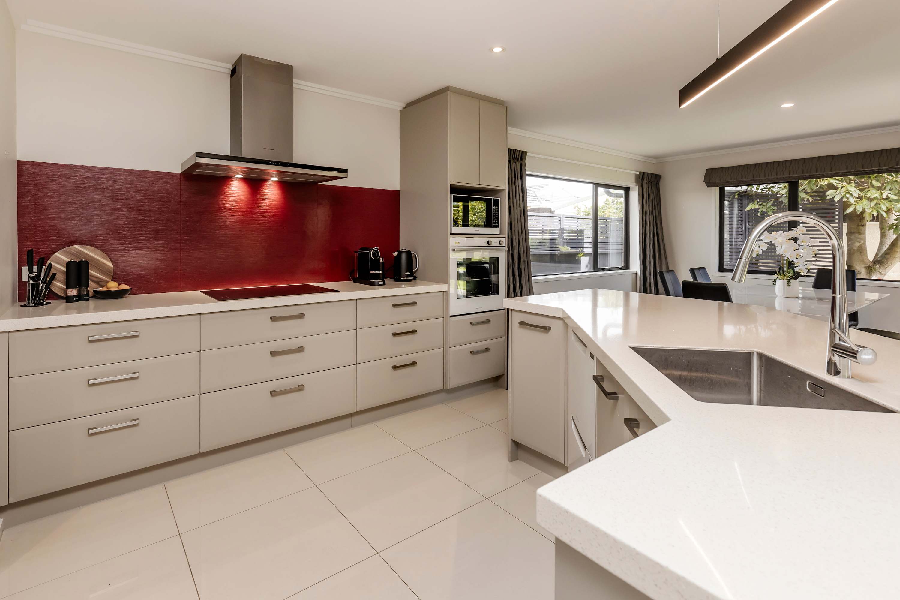 At the hub of this holiday home lies a large functional social kitchen with a large island and walk-in scullery. Relaxation begins here, with easy indoor-outdoor flow leading to the covered outdoor entertaining area, perfect for any weather. A private garden sets the scene for indoor-outdoor entertaining, while expansive open-plan living areas can be adjusted to create more intimate spaces depending on your mood.