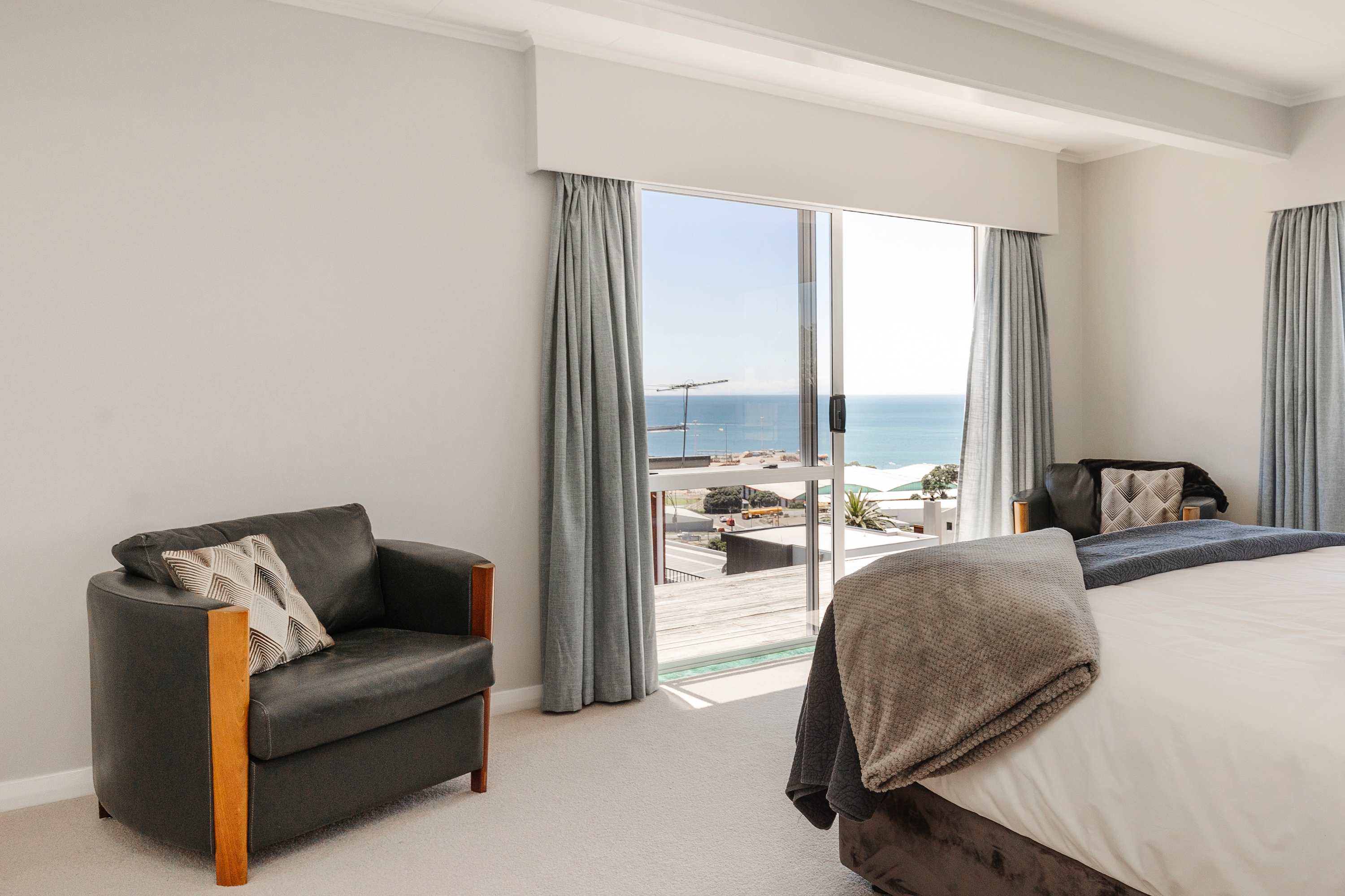 Ngamotu Vista offers stunning panoramic views of the sea and city, with yachts, ships, and beautiful changing light, all from an elevated, sun-soaked position that captures the beauty of the landscape. Perched in an elevated position, Ngamotu Vista showcases sweeping views of the sea and city, creating a picturesque backdrop for your stay. Whether watching yachts glide into the harbor, ships journey across the horizon, or the light shifting across the landscape, this two-storey retreat offers a front-row seat to New Plymouth's natural beauty.