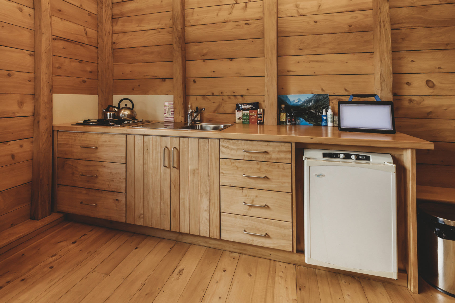 - Gas cooktop and small gas-operated fridge